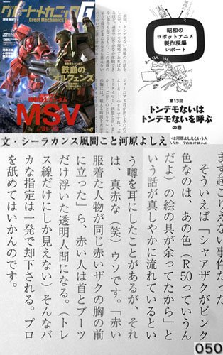 | … | 93無題Name名無し 26/02/16(月)03:42:42 IP:220.156.*(vmobile.jp)No.1806382+>監督と直で話してアニメの設定を提案するような(RX-78とかそうだよね)アニメ誌相手で |