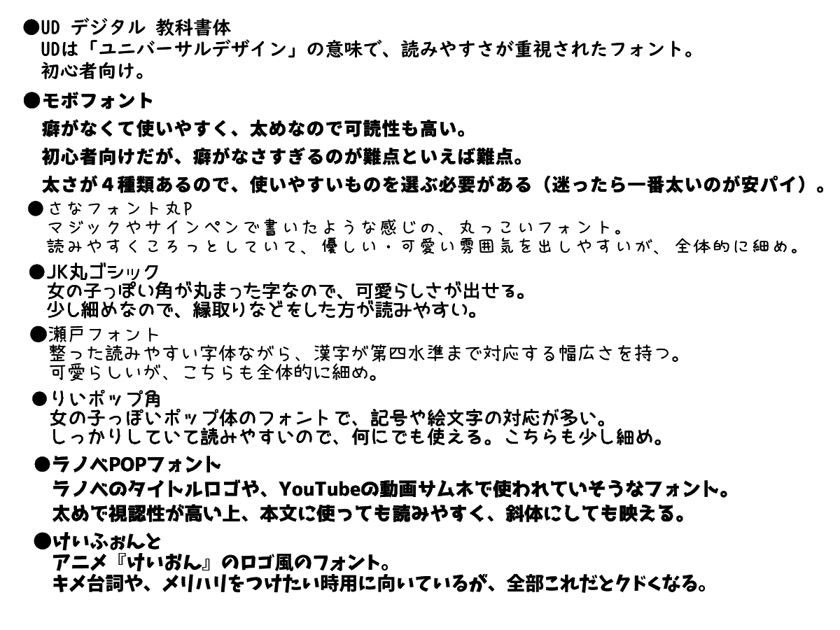 | … | 1無題Nameとしあき 26/02/21(土)23:30:27No.18169641+ 1771684227648.png-(89443 B) 画像はこれまでお勧めされたフォント一覧 |