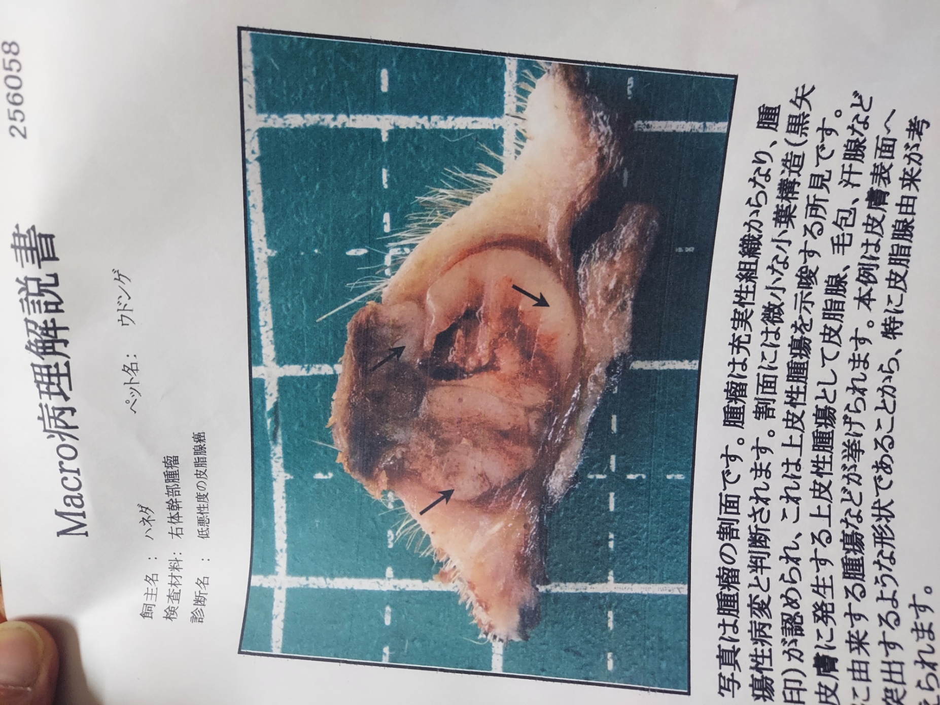 摘出した腫瘍の病理検査で悪性の皮脂腺腫ではありましたがリンパ腺への転移はなく全部取りきれたとのことで抜糸後は定期的に診察を受けることになります