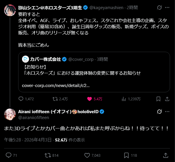 | … | 5無題Name名無し 26/03/24(火)10:36:16 IP:106.133.*(au-net.ne.jp)No.11741326そうだねx3楽になるってのもちょっと違ってライブとかイベントのリソースを別のところに回せるだけだ |