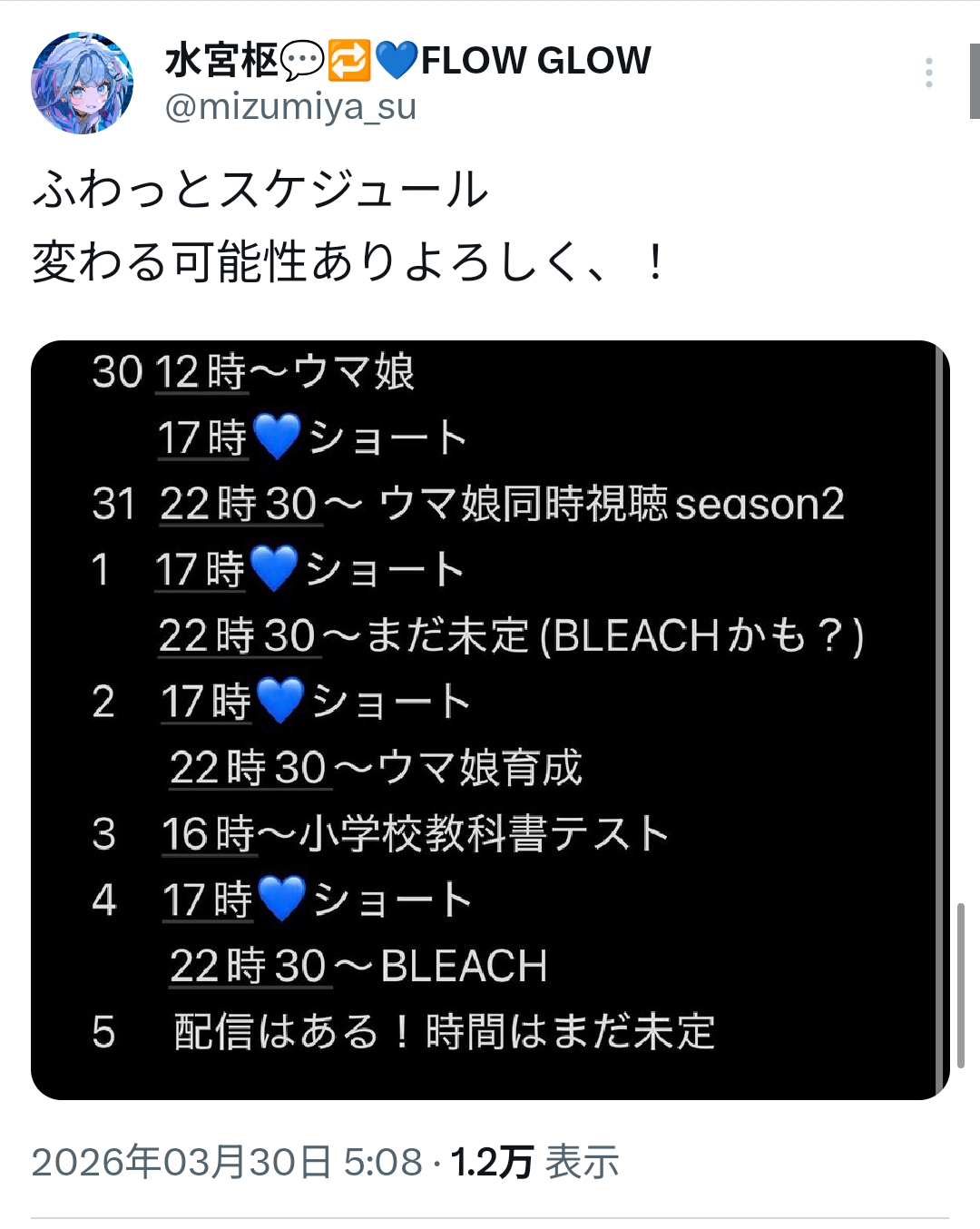 | … | 54無題Name名無し 26/03/30(月)09:01:41No.11779480そうだねx4 1774828901349.jpg-(361990 B) すうちゃんのスケジュール |