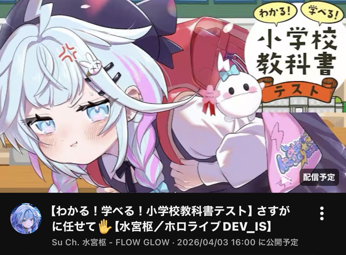 | … | 138無題Name名無し 26/04/03(金)19:58:04No.11808112+すうちゃんがちゃんと小学生ってわかる配信だった |