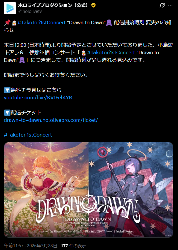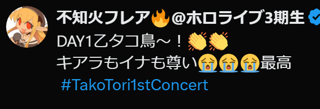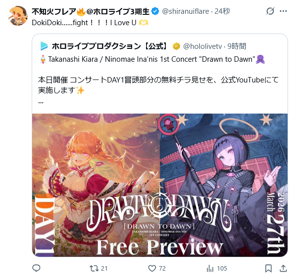 Takanashi Kiara / Ninomae Ina’nis 1st Concert "Drawn to Dawn"スレこのスレの書き込みはIPアドレスが表示されます。