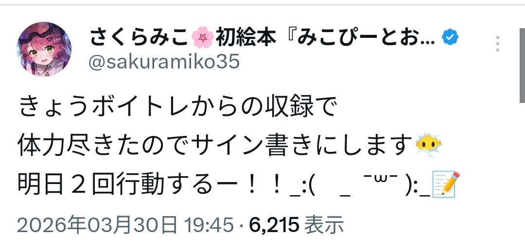 | … | 68無題Name名無し 26/03/30(月)20:00:53 IP:121.85.*(eonet.ne.jp)No.11780653+今日は珍しく推しが2人とも(みこち&すうちゃん)夜に配信がない |