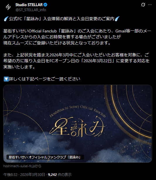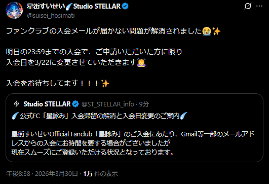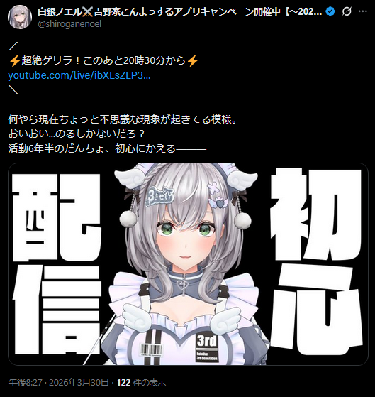| … | 77無題Name名無し 26/03/30(月)20:02:17 IP:60.98.*(bbtec.net)No.11780662+明日はSAN値の関係で配信なしです |