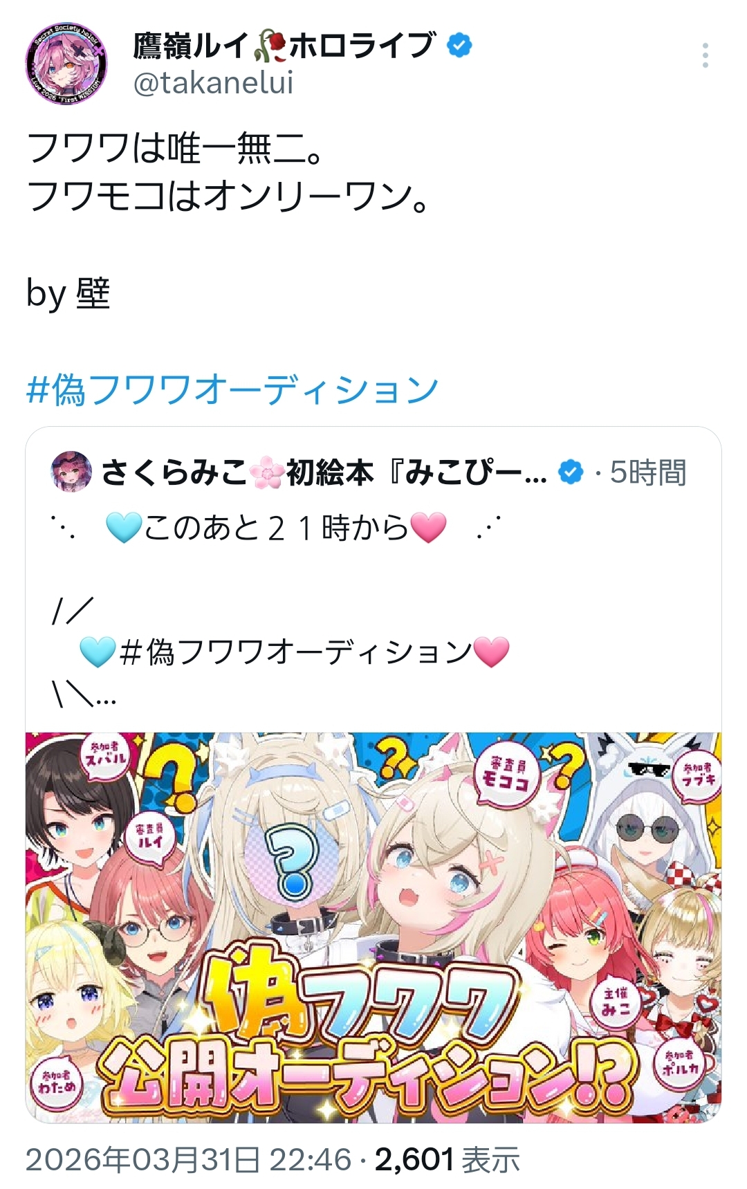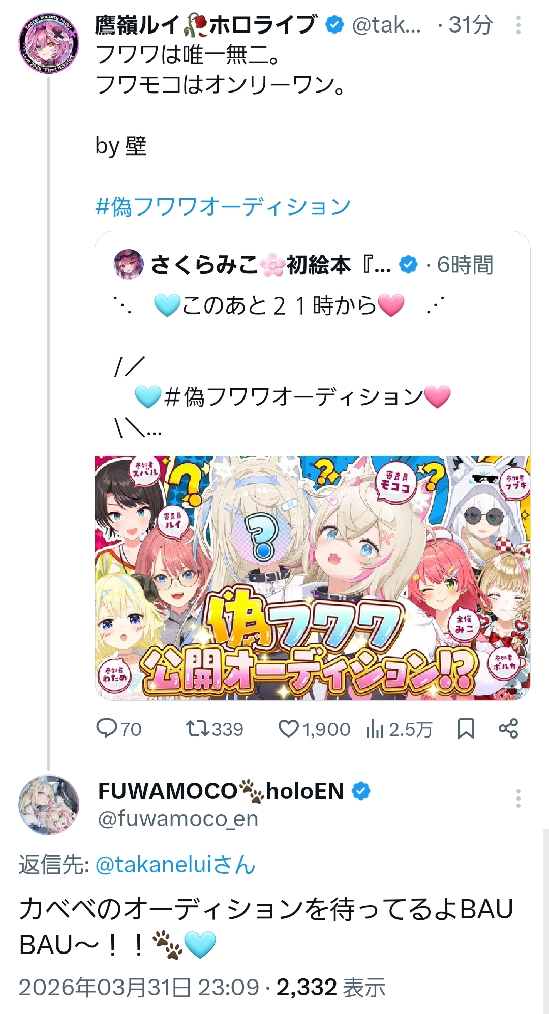 | … | 93無題Name名無し 26/03/31(火)22:31:00 IP:49.239.*(vmobile.jp)No.11789015+偽フワワ安心して任せられる4人の人選良かったな |