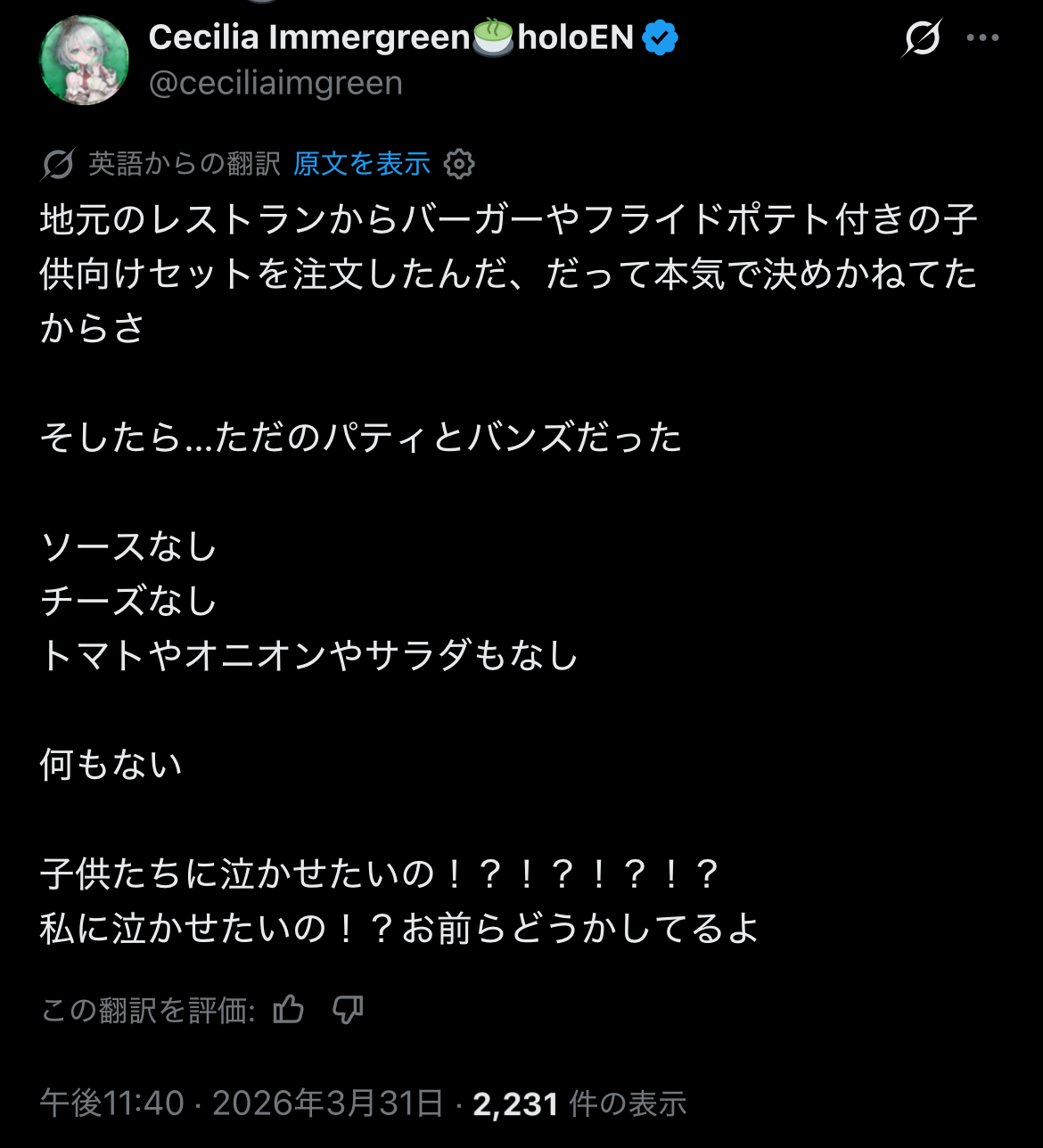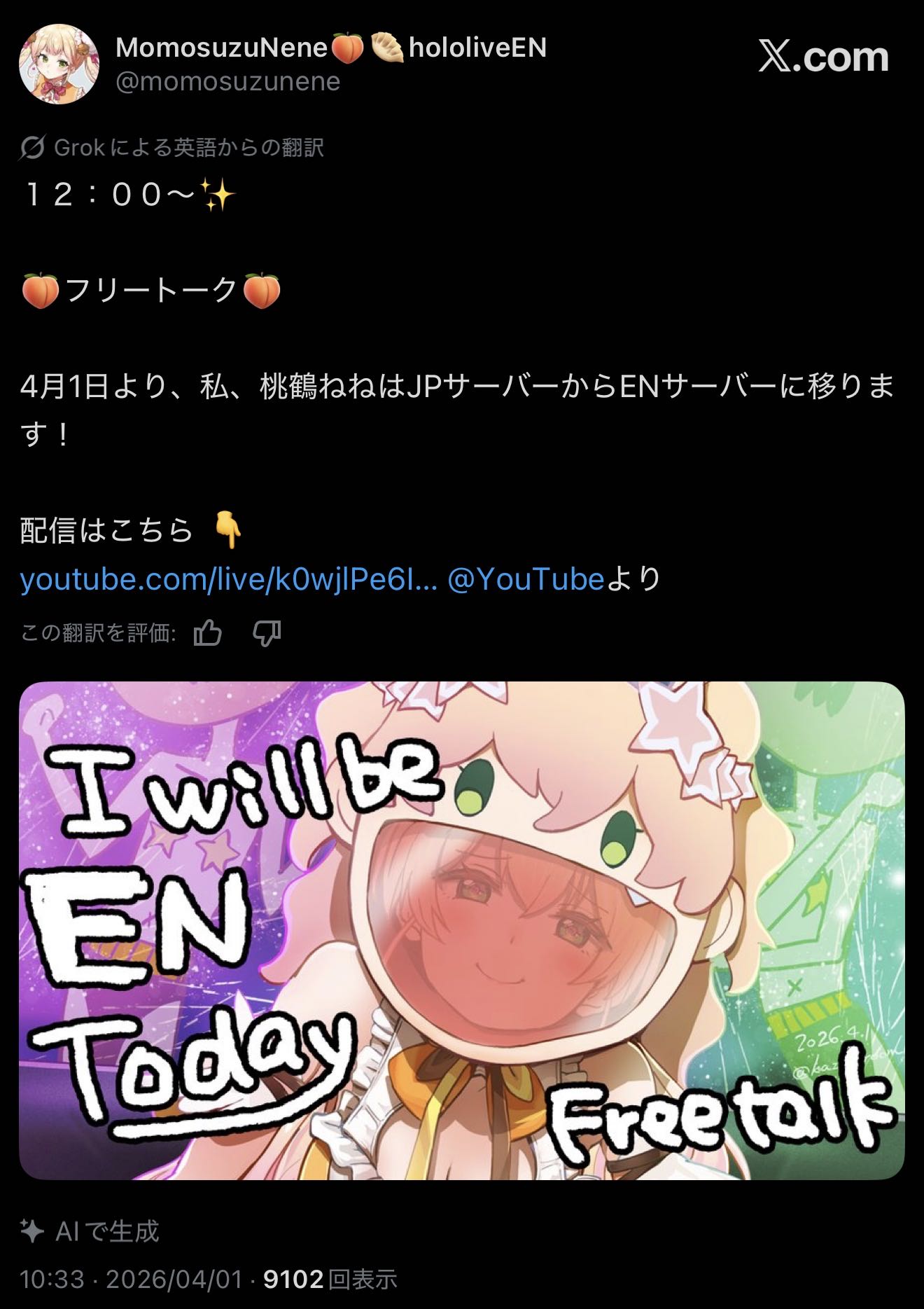 | … | 960無題Name名無し 26/04/01(水)10:40:40 IP:217.178.*(transix.jp)No.11790011+>ねねち!英語縛りいけんのか!? |