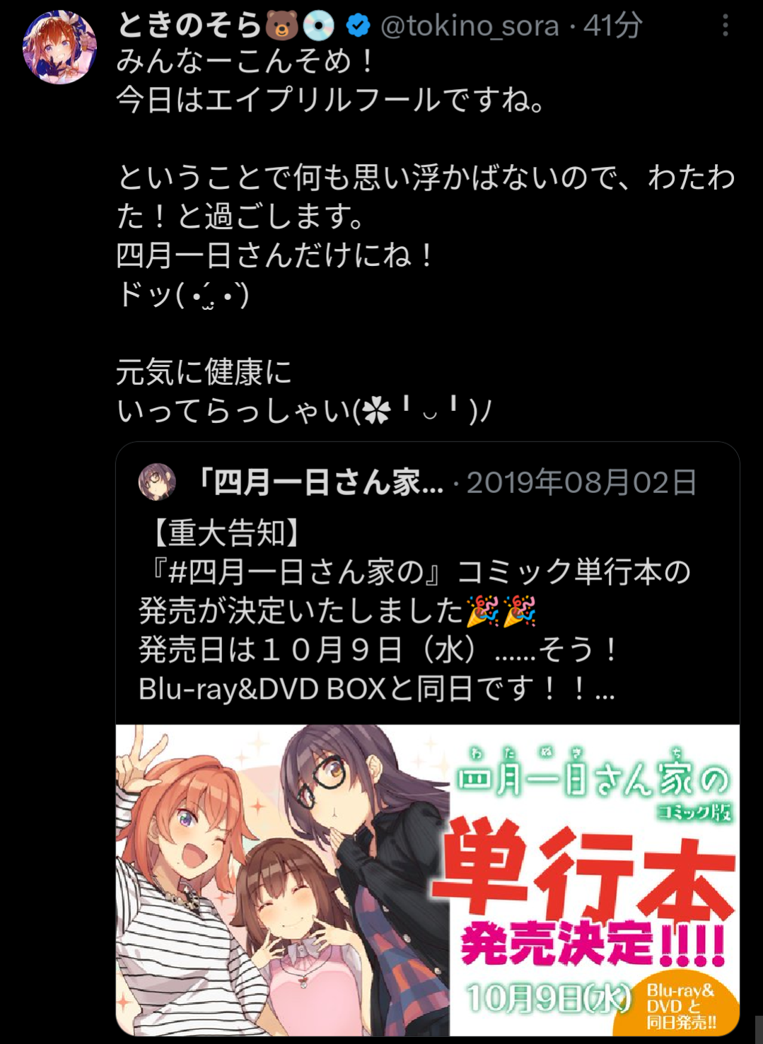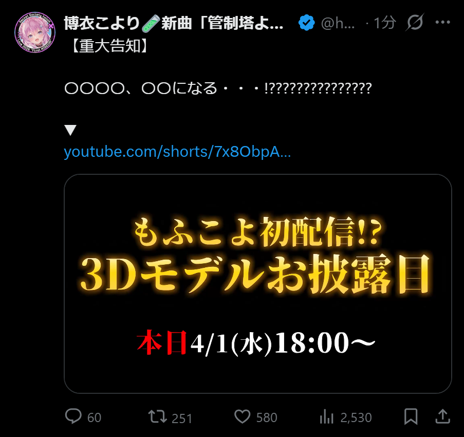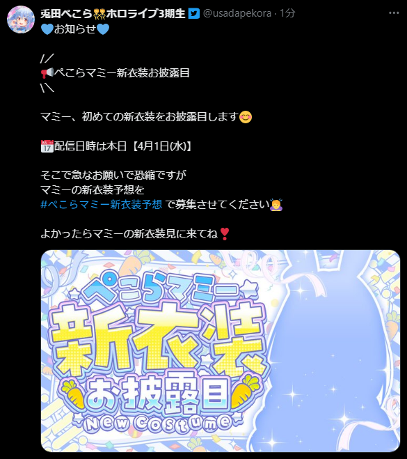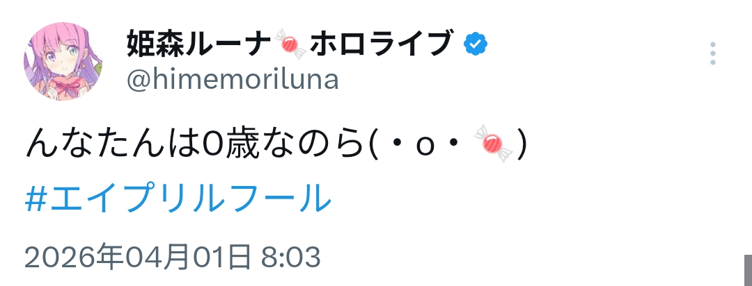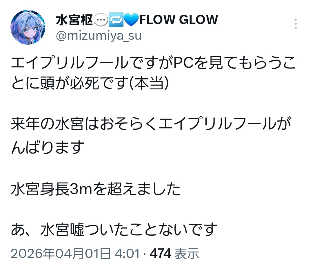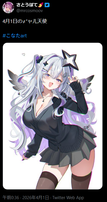 | … | 946無題Name名無し 26/04/01(水)10:30:10 IP:217.178.*(transix.jp)No.11789994+>なんかコメントにいるエイプリルフールは午前だけみたいな注意喚起 |