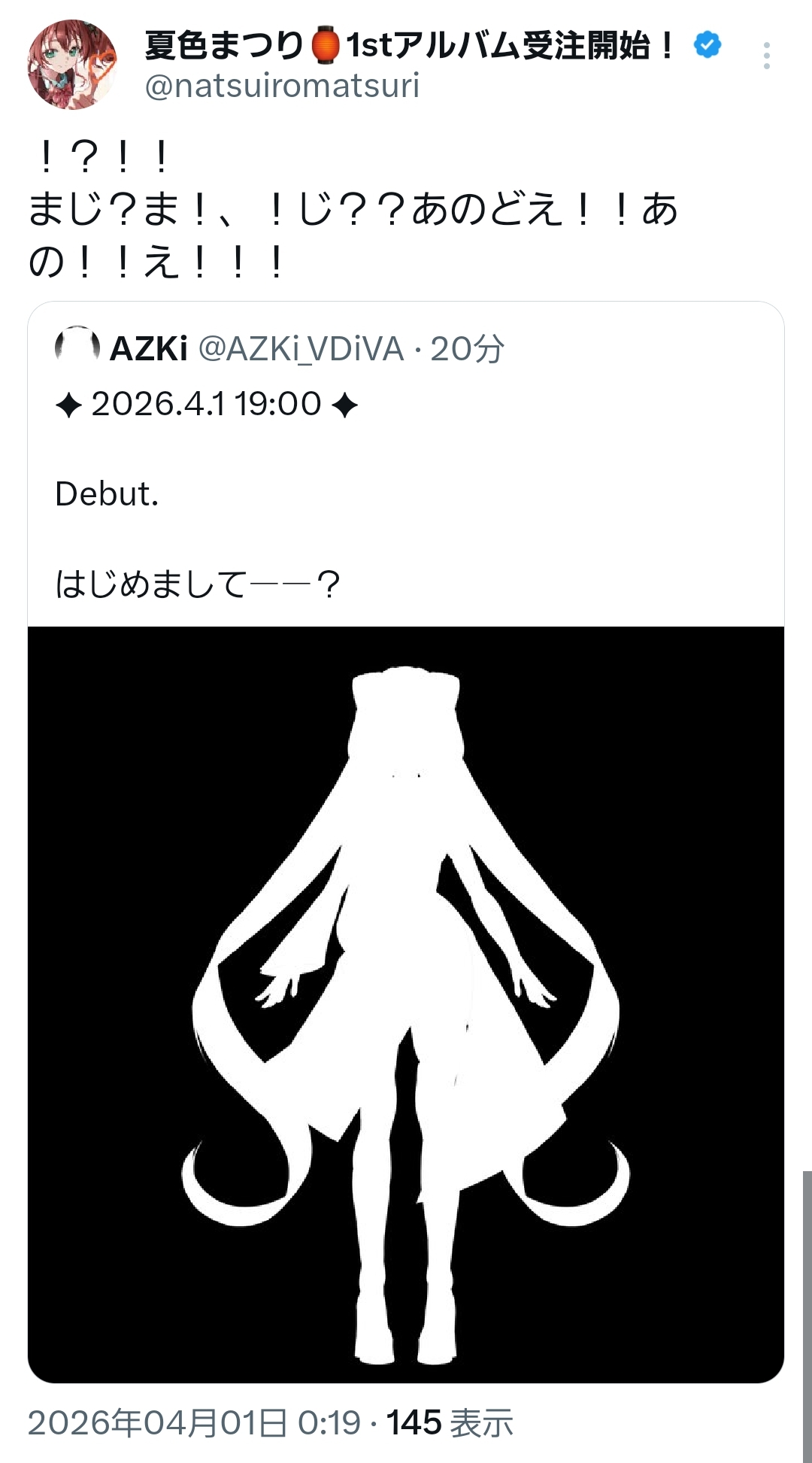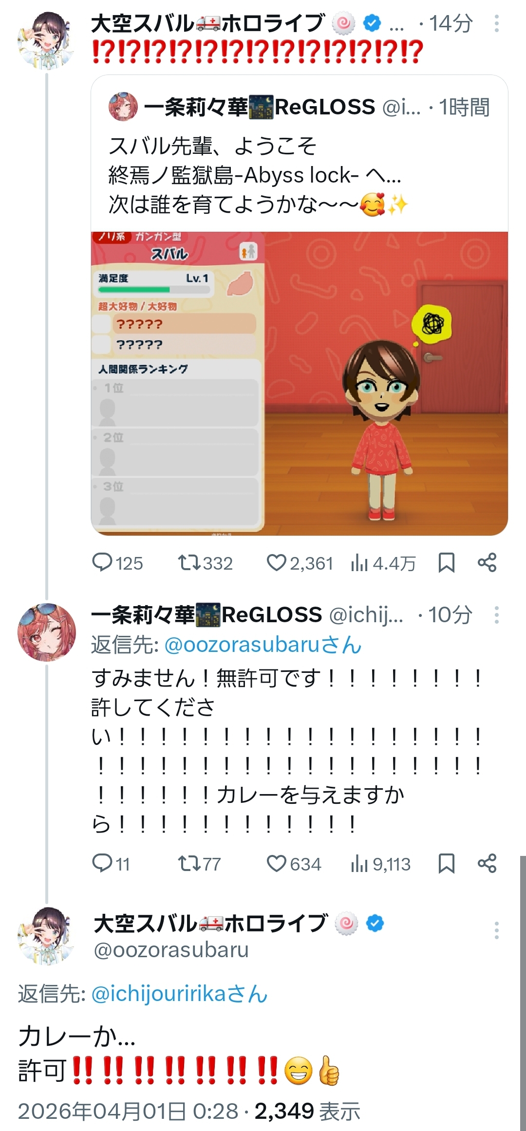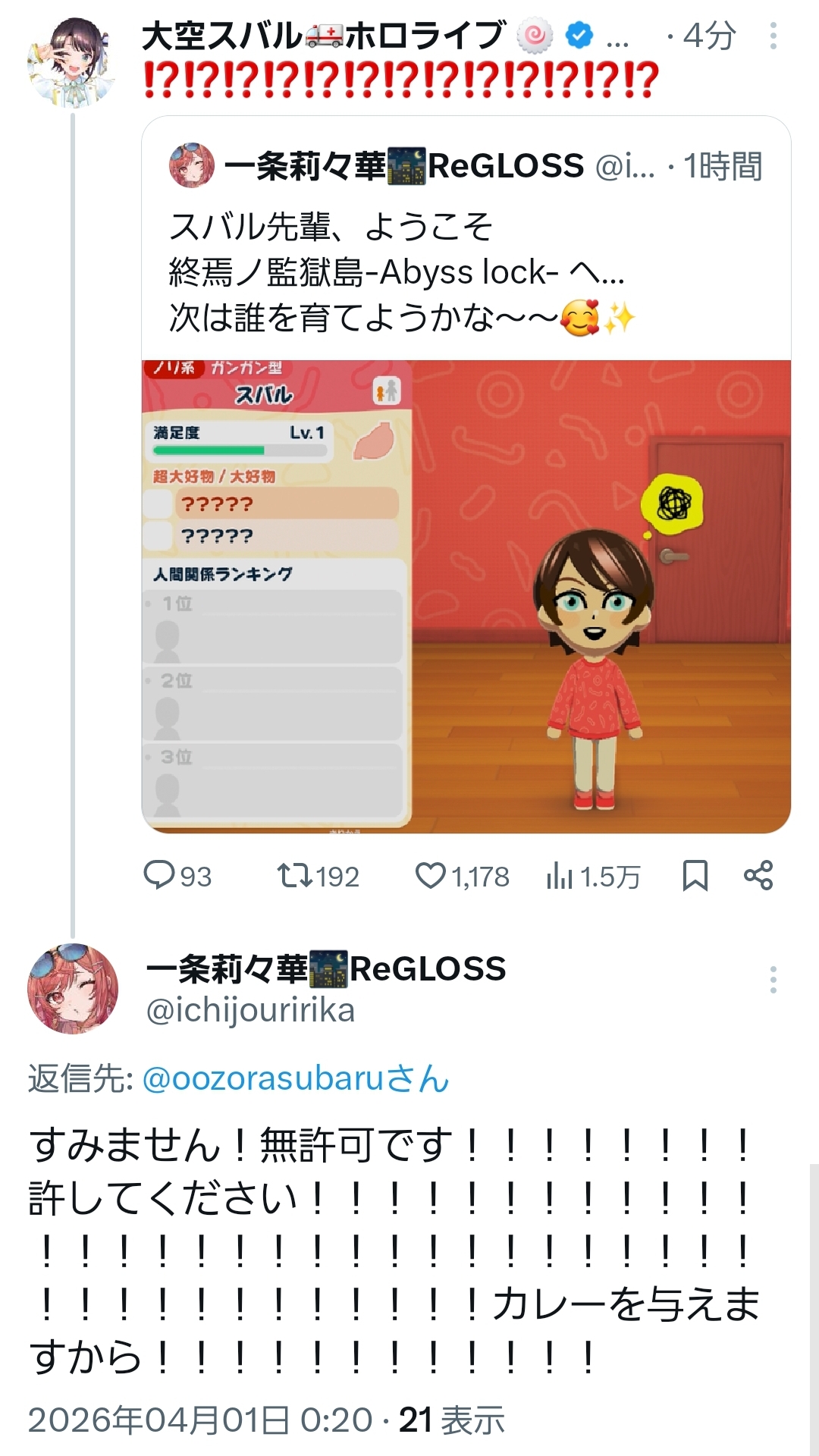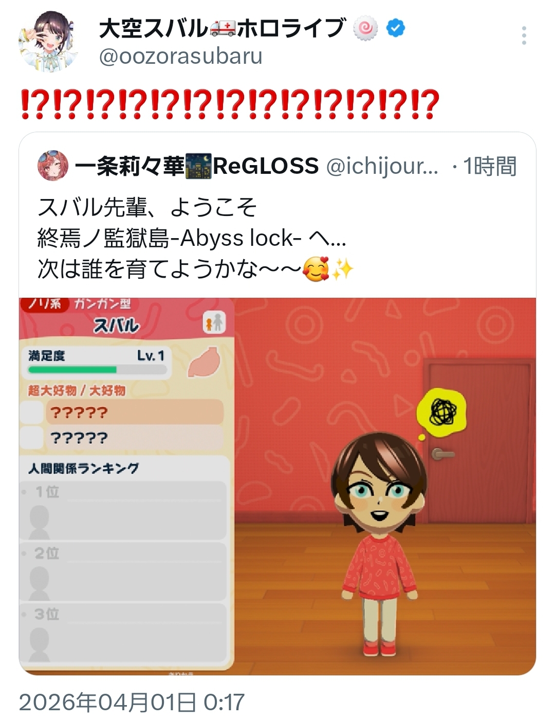 | … | 946無題Name名無し 26/04/01(水)10:30:10 IP:217.178.*(transix.jp)No.11789994+>なんかコメントにいるエイプリルフールは午前だけみたいな注意喚起 |