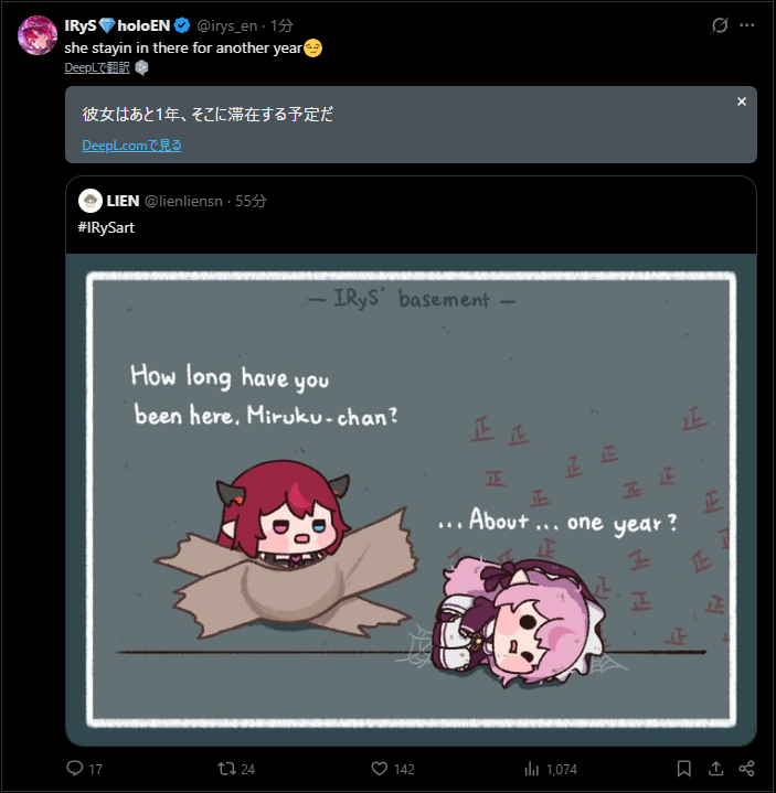 | … | 957無題Name名無し 26/04/01(水)10:37:49 IP:59.132.*(au-net.ne.jp)No.11790008+ねねち!英語縛りいけんのか!? |