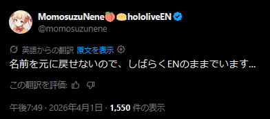 | … | 75無題Name名無し 26/04/01(水)19:50:13 IP:114.150.*(ocn.ne.jp)No.11792245そうだねx1おかしいな…初配信なのに涙が出てくるぞ… |