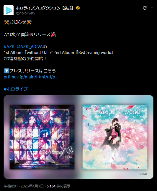 | … | 20無題Name名無し 26/04/01(水)19:48:42 IP:119.105.*(enabler.ne.jp)No.11792189そうだねx5>初配信でオリ曲を歌う |