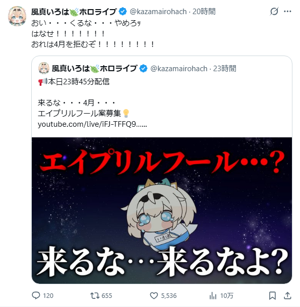 | … | 24無題Name名無し 26/04/01(水)19:48:44 IP:111.191.*(bbtec.net)No.11792194+初配信で重大発表を!? |