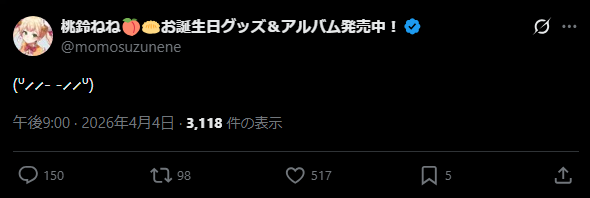 | … | 4無題Name名無し 26/04/04(土)21:02:51 IP:111.169.*(mesh.ad.jp)No.11816666+ねねちちん消ししました |