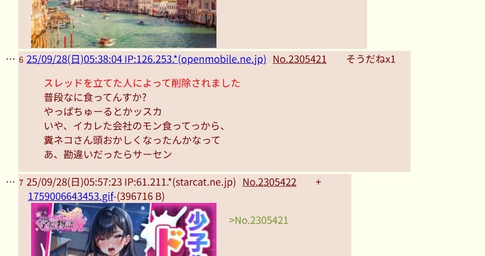 … | 25無題Name名無し 25/10/01(水)00:04:18No.264507+書き込みをした人によって削除されました |